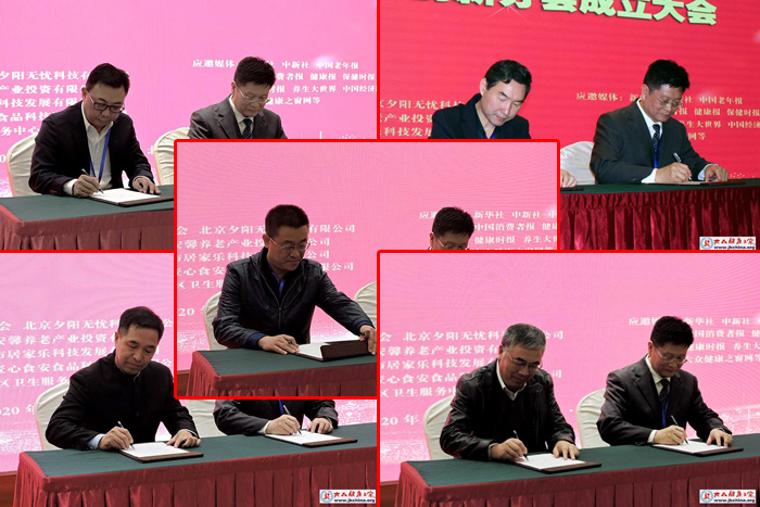 2020年10月25日,中国老年保健协会养老健康科技创新分会会长唐振兴分别同北京安馨养老产业投资有限公司董事长鄂俊宇、北京夕阳无忧科技有限公司董事长赵玉琢、北京蜂珍科技有限公司董事长许正鼎、怀山堂生物科技股份有限公司总经理康明轩、天津市居家乐科技发展有限公司总经理孙波就居家适老化环境改造、物联网和智能化养老服务、开发蜂产品系列适老健康产品、开发怀山药系列适老健康产品、社区试点居家养老服务方面签订了战略合作协议。
