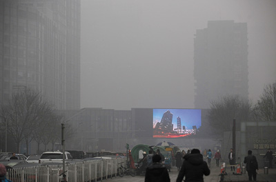 12月1日,北京遭遇严重雾霾天气,国贸地区一块广告牌上蓝天分外惹眼。米 杜摄(人民视觉)