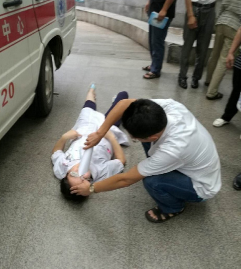 不久前的一天早上,在浙江省衢州市江山人民医院大厅门口,一辆120救护车急驶而来,车子停稳后,一位女医生刚踏出车门就瘫软地躺在了地上。急救车的司机冲过来,只见女医生指了指车里,艰难地挤出几个字:“别管我,快……快把病人送上去……”之后便晕了过去。这时,大楼里的医护人员闻讯赶来,将救护车里的一名大出血的孕妇送往抢救室。同时,参与救治的王医生赶紧跪在地上对晕倒的女医生进行急救。这一幕被救护车的驾驶员用手机拍了下来,发到了朋友圈。