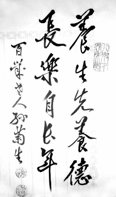 孙老痴情翰墨丹青,终生不辍,这也是他益寿延年、安享高寿的主要原因之一。孙老在书画创作时,从不翻旧稿,笃信推陈出新,反对重复过去,他认为,创作一定要勤于用脑、精心构思,不断锐意进取。他介绍说,书画创作是最适合自己的锻炼:“写字作画时需澄心闭息,精神专一,排除杂念,因而可迅速入静。在安心入静,呼吸调匀后,使心与息相依,意与气相合,最终才能达到意收笔端、抒怀写态、酣畅淋漓、乐以忘忧的效果,可调身、调心、调息。”
