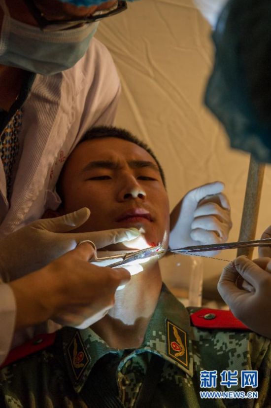 4月21日,在四川省芦山人民医院,医护人员为抢险救援受伤的战士巩广增缝合伤口。 4月20日,四川雅安芦山发生7.0级地震。芦山人民医院大楼严重损毁,已经封闭。来自省内外的多家医院在芦山县人民医院的大院内搭起了医疗帐篷,部分受伤群众在帐篷内接受救治。医护人员轮流值班,全力救治伤员。各地医疗机构还在陆续赶来,充实救治力量。新华社记者陈诚摄
