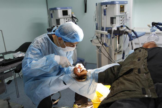 救援队队员正在为受伤患者进行手术治疗
