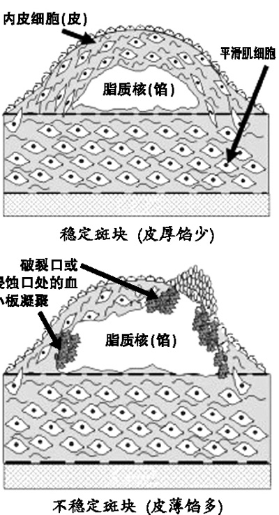以上两例患者同样是冠心病、心绞痛,但却分为稳定劳力型心绞痛和不稳定心绞痛,并且需要采取不同的治疗。这种差异要从冠心病的发病机理说起,冠心病多数是因为心脏的滋养血管——冠状动脉,发生粥样硬化引起的。由于各种原因冠状动脉的内皮下形成粥样斑块,斑块由外面的纤维帽包裹着脂质核组成。稳定斑块像包子,“皮厚馅少”不容易破裂,当狭窄超过70%以上,加之各种原因引起心率增快后,心肌供血不足,导致劳力型心绞痛。不稳定斑块像水饺,“皮薄馅多”容易发生破裂,破裂后激活凝血系统,导致血管内血栓形成,堵塞了冠状动脉,便会发生不稳定心绞痛,甚至心肌梗死。