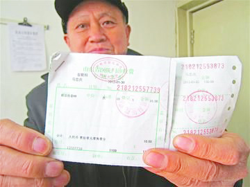 马先生向记者出示他在山东省眼科医院就诊时的一张交费收据。(记者 王宝静 摄)