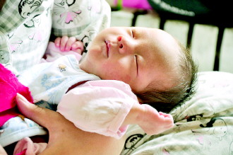 “来小孩”在妈妈怀里熟睡。