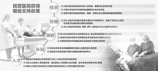 《意见》提出,明确公立医疗机构的数量、规模和布局,坚持公立医疗机构面向城乡居民提供基本医疗服务的主导地位。同时,鼓励企业、慈善机构、基金会、商业保险机构等以出资新建、参与改制、托管、公办民营等多种形式投资医疗服务行业。大力支持社会资本举办非营利性医疗机构,提供基本医疗卫生服务。进一步放宽中外合资、合作办医条件,逐步扩大具备条件的境外资本设立独资医疗机构试点。各地要清理取消不合理的规定,加快落实对非公立医疗机构和公立医疗机构在市场准入、社会保险定点、重点专科建设、职称评定、学术地位、等级评审、技术准入等方面同等对待的政策。