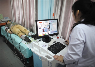 展览路社区卫生服务中心居民健康监测区,社区医生在监测社区居民心血管功能健康状况。资料图片