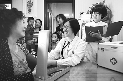 社区卫生服务中心的家庭医生上门为居民测量血压,并指导用药。 CFP