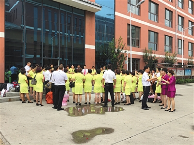 8月13日,在天津武清权健集团总部,人潮涌动。新京报记者看到,一拨身着黄色、白色统一制服的权健销售人员聚集在一起。有演讲者站在中间,分享工作得失,说到动情处潸然泪下。演讲完毕后,人群中响起整齐划一的拍掌声和口号声:好!很好!非常好!权健最好!耶!