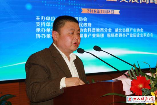 大众健康之窗讯 11月8日,由中国保健协会主办、恩施州人民政府支持、中国保健协会科普教育分会和湖北省硒产业协会共同承办、恩施德源健康产业集团和恩施市硒谷产业园企业联合会协办,以“科学补硒,健康生活,分享硒产业成果,推动硒产业发展”为主题的第二届硒与大健康暨富硒养生旅游高峰论坛在北京隆重举行。图为中国保健协会科普教育分会专家委员会副主任委员、中国食品报首席评论员李松主持论坛。