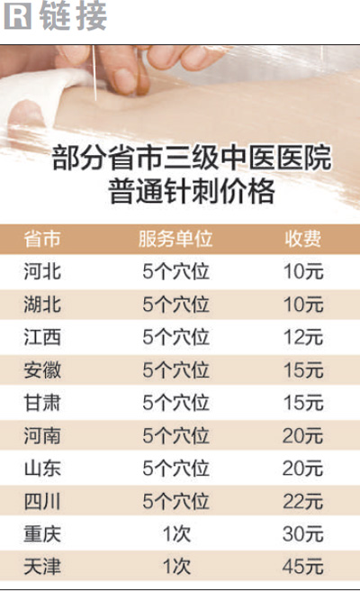 2016年,国家发改委等4部委出台《推进医疗服务价格改革的意见》,要求“重点提高诊疗、手术、康复、护理、中医等体现医务人员技术劳务价值的医疗服务价格”。不少省市调整医疗服务价格后,针刺价格依然超低。本报记者对部分省市三级中医医院针刺价格进行调查后发现:河北每5个穴位10元,天津每人次45元,浙江小于等于20个穴位每针4元、大于20个穴位每人次81元。公立医院和民营医院实行价格双轨制:公立医院执行的是政府指导价,民营医院执行的是市场调节价。民营医院针灸一次100元,某些特色针法高达上千元,公立医院成了针灸“价格洼地”。