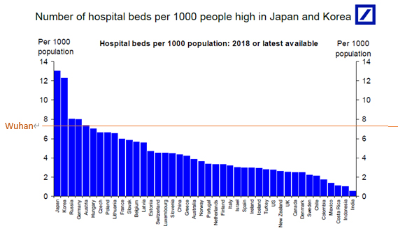 胡豫提出“平战结合”的初衷是分析疫情初期医疗资源挤兑最主要原因,是医疗资源结构性不均衡。整体上看,武汉市每千人口床位数远超全国平均水平,更超过OECD(经合组织)国家平均水平(2018年,武汉7.48>全国6.03)。但专科而言,传染病医院床位数低于国家设置标准(武汉0.64床/万人<国家标准1.2~1.5床/万)。因此,在遇到大型突发传染病事件(全国新冠肺炎确诊患者已达8万余例,武汉市累计50339人次),若不进行医疗资源整合,则难以满足突发传染病收治需求。