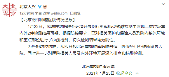 据“北京大兴”官方微博消息,1月23日,北京南郊肿瘤医院在对医院外环境开展例行新冠肺炎核酸检测中发现二层垃圾车内外2件检测结果可疑。根据防控要求,已对相关医护和保障人员及院内整体环境和重点部位进行了核酸检测,初次检测结果均为阴性。