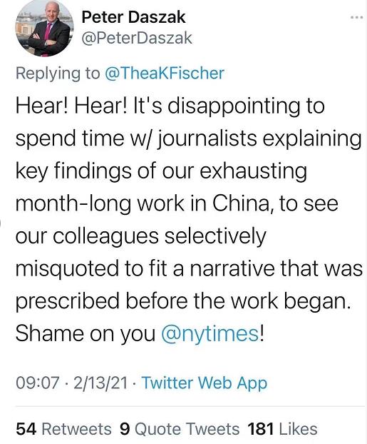 世界卫生组织麻疹、风疹、流感和小儿麻痹症参考实验室负责人、公共卫生专家西娅·菲舍尔(Thea K Fischer)也在推特上发帖表示《纽约时报》的报道严重扭曲了她所说的话:“这也不是我在流行病学团队得到的经验。中国方面和国际流行病学团队建立了良好的关系,(我们)进行的热烈讨论也反应了(中国方面的)高度参与。我们说的话被严重扭曲,这为重要的科学工作带来了阴影。”