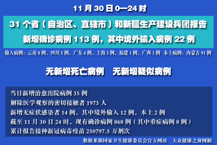 据国家卫生健康委员会官方网站12月1日发布,11月30日0—24时,31个省(自治区、直辖市)和新疆生产建设兵团报告新增确诊病例113例。其中境外输入病例22例(云南8例,四川5例,广东4例,上海3例,福建1例,广西1例),含3例由无症状感染者转为确诊病例(均在四川);本土病例91例(均在内蒙古呼伦贝尔市)。无新增死亡病例。无新增疑似病例。