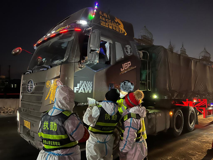 先锋路出城口是进出哈尔滨的咽喉要道。4日18时,气温低至近零下20摄氏度,哈尔滨市道外区园林局天恒山园林养护中心副主任张隆昌和同事们身穿荧光色工作服,配合公安部门查验过往车辆驾驶员的行程码、健康码及核酸检测报告,确认正常后才通行。尽管“全副武装”,在寒风侵袭中,他们仍要不断跺脚驱寒。