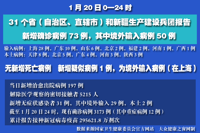 据国家卫生健康委员会官方网站1月21日发布,1月20日0—24时,31个省(自治区、直辖市)和新疆生产建设兵团报告新增确诊病例73例。其中境外输入病例50例(上海28例,广东10例,山东6例,北京2例,福建2例,河南1例,广西1例),含2例由无症状感染者转为确诊病例(河南1例,广东1例);本土病例23例(天津8例,均在津南区;北京5例,其中房山区3例、丰台区2例;广东4例,均在珠海市;河南3例,均在安阳市;陕西3例,均在西安市)。无新增死亡病例。新增疑似病例1例,为境外输入病例(在上海)。