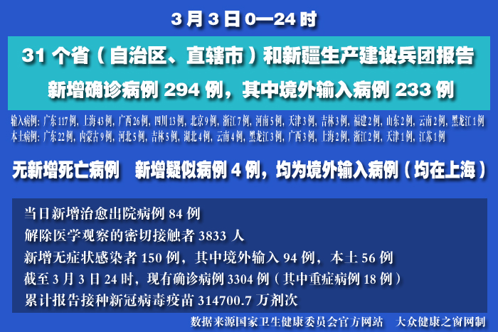 据国家卫生健康委员会官方网站3月4日发布,3月3日0—24时,31个省(自治区、直辖市)和新疆生产建设兵团报告新增确诊病例294例。其中境外输入病例233例(广东117例,上海43例,广西26例,四川13例,北京9例,浙江7例,河南5例,天津3例,吉林3例,福建2例,山东2例,云南2例,黑龙江1例),含14例由无症状感染者转为确诊病例(广东6例,四川4例,河南2例,黑龙江1例,浙江1例);本土病例61例(广东22例,均在深圳市;内蒙古9例,均在呼和浩特市;河北5例,其中邢台市4例、石家庄市1例;吉林5例,其中延边朝鲜族自治州4例、吉林市1例;湖北4例,均在武汉市;云南4例,其中红河哈尼族彝族自治州2例、保山市1例、德宏傣族景颇族自治州1例;黑龙江3例,均在哈尔滨市;广西3例,均在防城港市;上海2例,其中闵行区1例、松江区1例;浙江2例,均在温州市;天津1例,在东丽区;江苏1例,在徐州市),含5例由无症状感染者转为确诊病例(广西2例,云南2例,广东1例)。无新增死亡病例。新增疑似病例4例,均为境外输入病例(均在上海)。