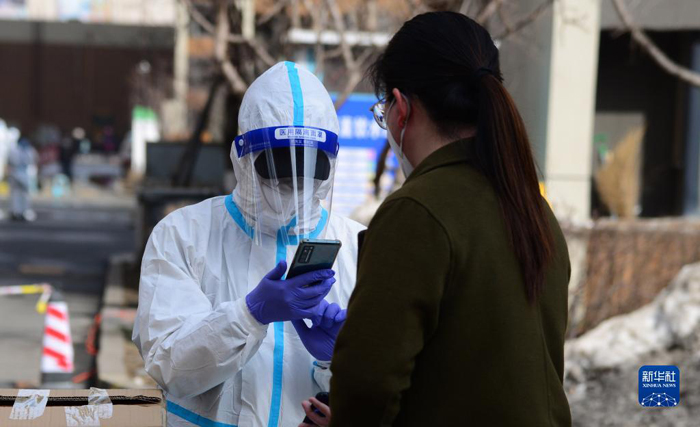 3月24日,在长春市南关区一处核酸检测点,居民扫码登记信息。新华社记者 张建 摄