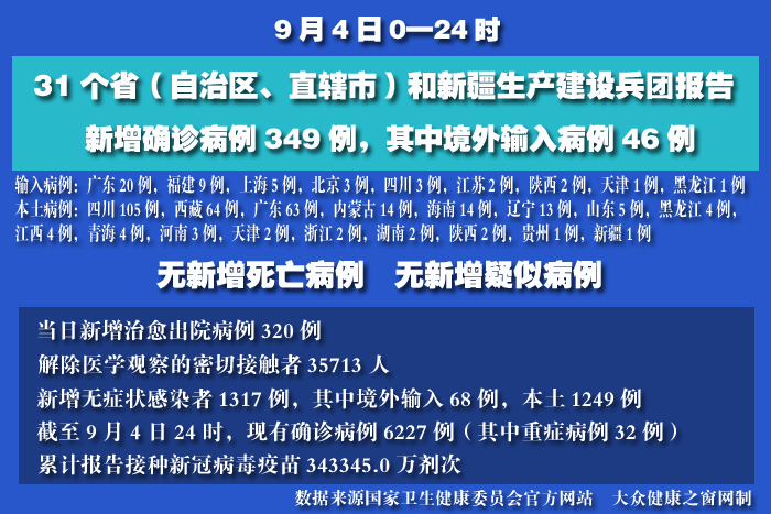 据国家卫生健康委员会官方网站9月5日发布,9月4日0—24时,31个省(自治区、直辖市)和新疆生产建设兵团报告新增确诊病例349例。其中境外输入病例46例(广东20例,福建9例,上海5例,北京3例,四川3例,江苏2例,陕西2例,天津1例,黑龙江1例),含6例由无症状感染者转为确诊病例(广东4例,北京1例,陕西1例);本土病例303例(四川105例,西藏64例,广东63例,内蒙古14例,海南14例,辽宁13例,山东5例,黑龙江4例,江西4例,青海4例,河南3例,天津2例,浙江2例,湖南2例,陕西2例,贵州1例,新疆1例),含34例由无症状感染者转为确诊病例(海南10例,黑龙江4例,辽宁3例,河南3例,四川3例,山东2例,湖南2例,广东2例,青海2例,浙江1例,西藏1例,新疆1例)。无新增死亡病例。无新增疑似病例。