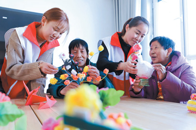 甘肃省张掖市民乐县六坝镇综合养老服务中心内,志愿者在教老人制作手工艺品。王 将摄(影像中国)