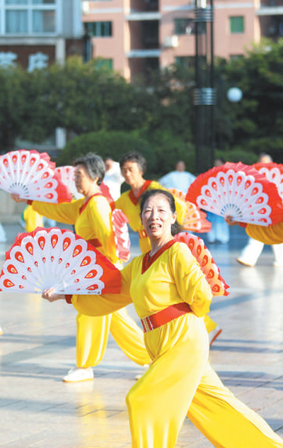 重庆市梁平区人民广场,老年太极爱好者在表演太极扇。刘 辉摄(影像中国)