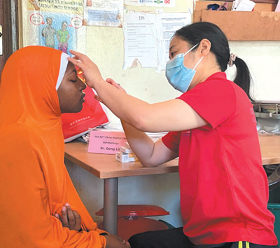 8月27日,中国(江苏)第三十二期援桑给巴尔医疗队眼科医生董莉莉(右)在坦桑尼亚桑给巴尔岛为当地患者检查。本报记者 侯露露摄
